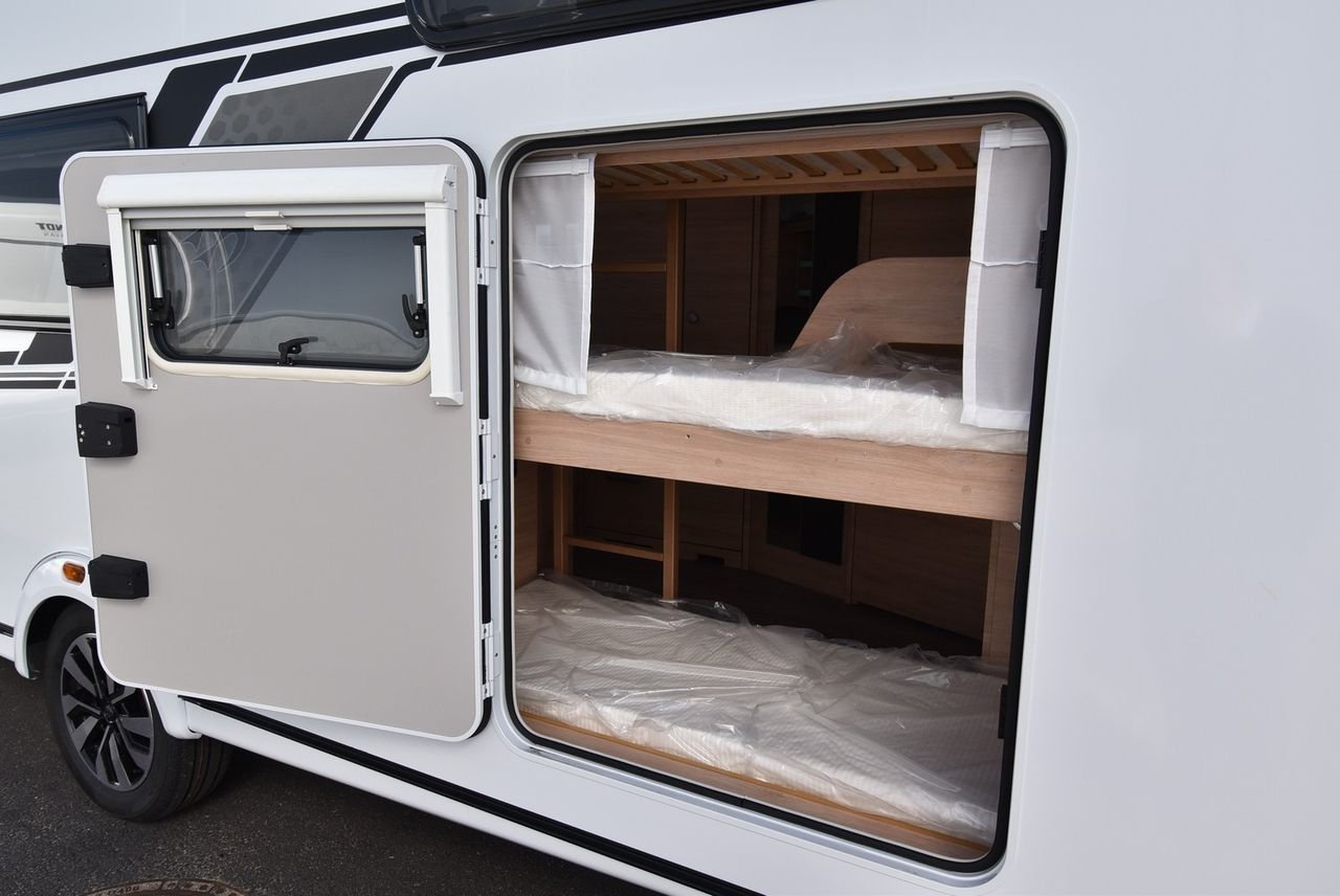 Couchette triple pour les enfants et lit double fixe. Vous pouvez également poser une table dans le coin salon et bénéficier de 2 couchages supplémentaires.