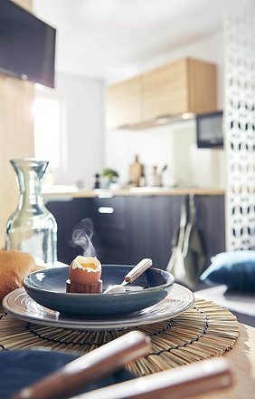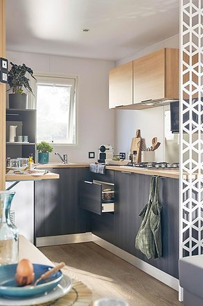 - Cuisine décalée sur l’arrière qui offre du volume et de l’espace.